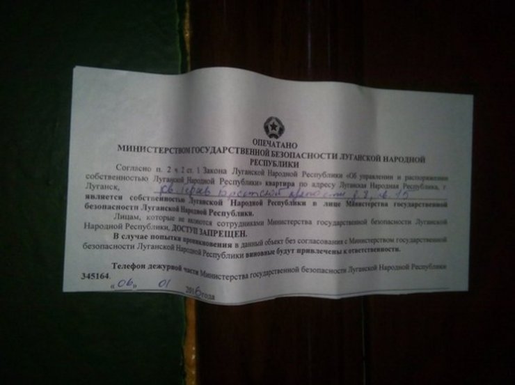 В соцсети обнародована фотография, где двери одной из квартир Луганска опечатаны бумагой, в которой указано, что жилье переходит в собственность так называемой "ЛНР".
