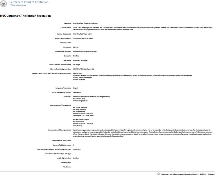 Соответствующая информация обнародована на сайте Гаагского арбитража