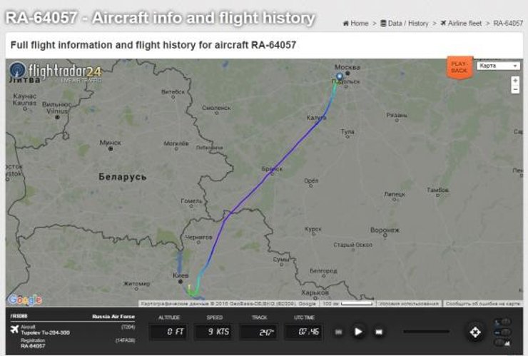 "На сервисе отслеживания полетов Flightradar24 есть информация, что самолет Туполев Ту-204-300 (RA-64057) вылетел из Москвы в 8:01 и сел в Борисполе в 09:19", - отмечается в публикации.