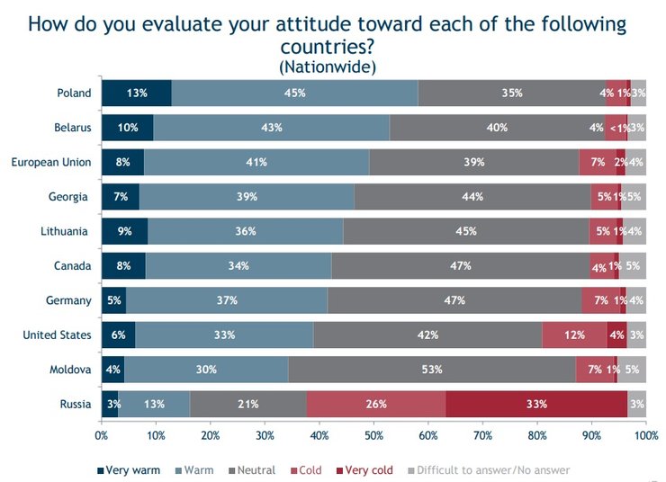 В частности, "очень тепло" и "тепло" к соседней Польше относятся 58% опрошенных украинцев, к Беларуси – 53%, к Евросоюзу – 49%. Также украинцы симпатизируют Грузии (46%), Литве (45%) и Канаде (42%).