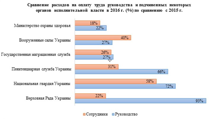 Для большинства работников государственных учреждений зарплаты увеличатся примерно на 17% по сравнению с 2015 годом. Однако при этом депутаты Верховной Рады Украины будут зарабатывать на 93% больше, чем в прошлом году, руководство Нацгвардии – на 72%, а управленцы пенитенциарной службы Украины – на 66%.