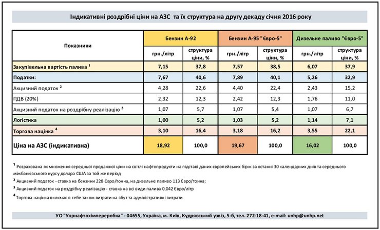 По данным Минэнерго, значительное влияние на цену топлива на АЗС оказывает также закупочная стоимость топлива, которая в структуре цены занимает около 38%. В частности, закупочная цена бензина А-92 во второй декаде января составляет 7,15 грн за литр, или 37,8% от общей стоимости, бензина А-95 (Евро-5) – 7,57 грн за литр, или 38,5% от общей стоимости, дизельного топлива – 6,07 грн за литр, или 37,5% от общей стоимости.