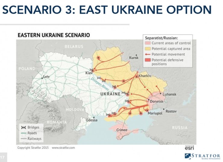 По мнению исследователей Stratfor, возможны еще три сценария: ограниченный захват новых территорий на востоке Украины, расширение границ оккупированных территорий и временные вторжения вдоль всей линии украинской границы.