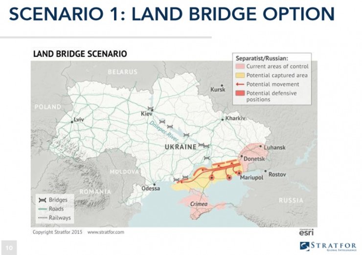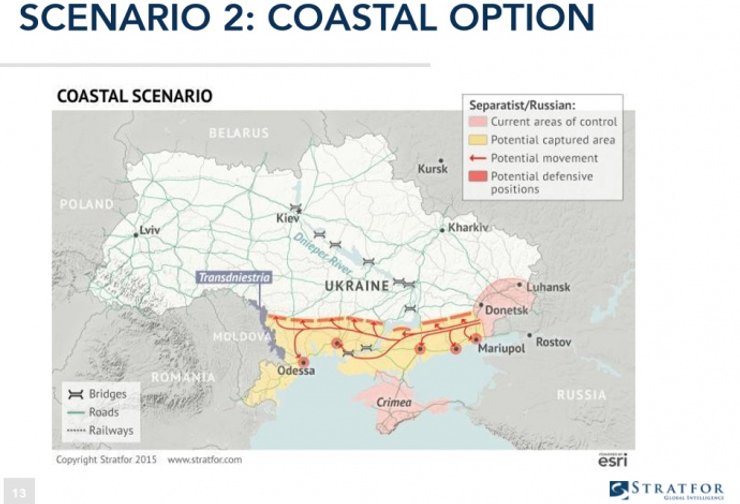 Сценарий №2 предполагает захват всего южного побережья Украины и соединение оккупированного Донбасса с Крымом и Приднестровьем. Для этого, по мнению специалистов Stratfor, России нужно 40-60 тыс. военных для наступления плюс 80-112 тыс. военных для обороны. Украине для удержания плацдармов понадобится от 13,2-120 тыс. военных.