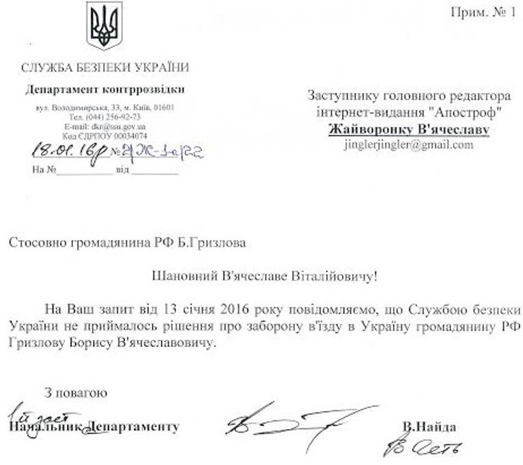 "Служба безопасности Украины не принимала решение о запрете въезда в Украину гражданину РФ Грызлову Борису Вячеславовичу", – отмечается в документе.