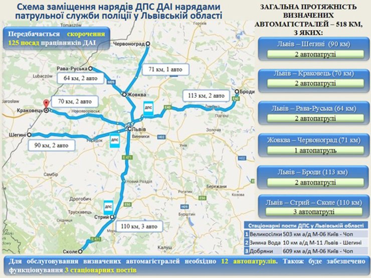 Деканоидзе проинформировала, что патрульная полиция будет круглосуточно посменно дежурить в составе 12 автомобильных патрулей на шести отрезках трасс общей протяженностью 518 км: "Львов – Шегини", "Львов - Краковец", "Львов – Рава-Русская", "Жовква – Червоноград", "Львов – Броды" и "Львов – Стрый – Сколе".
