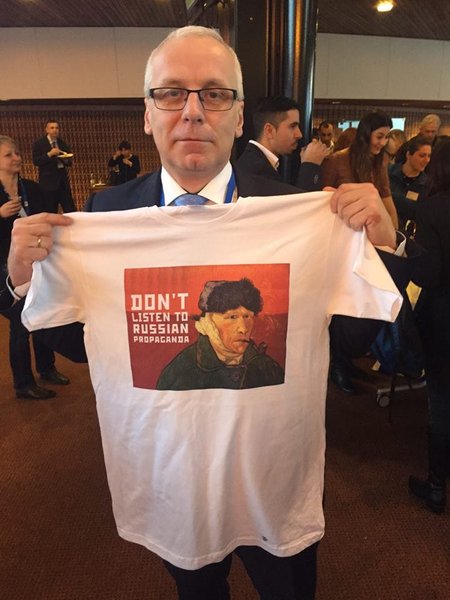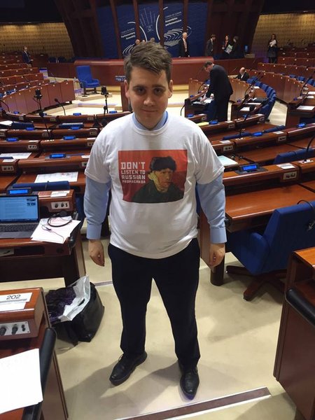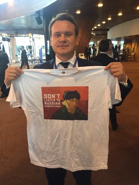 Народный депутат Алексей Гончаренко, находясь на зимней сессии Парламентской ассамблеи Совета Европы (ПАСЕ), раздал делегатам в рамках информационной кампании Pro Ukraine футболки со слоганом – Don't listen to Russian propaganda ("Не слушайте российскую пропаганду", – ред.). Об этом сообщает "Апостроф".