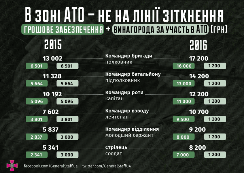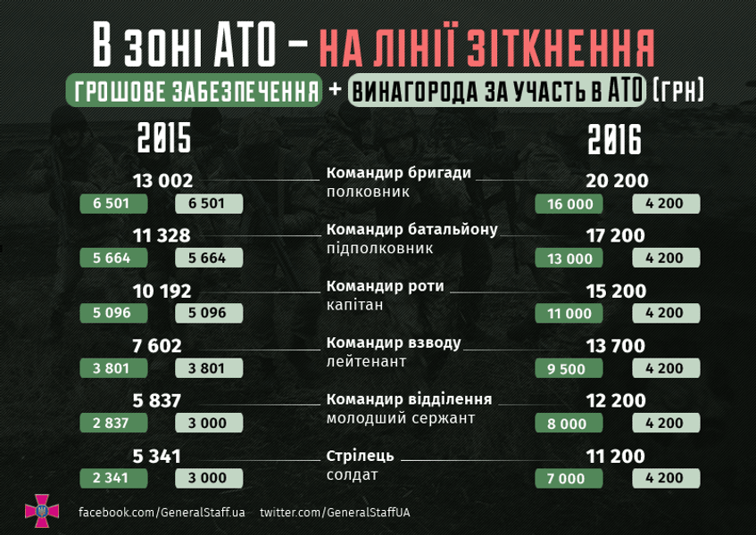 В Генеральном штабе Вооруженных сил Украины решили продемонстрировать, каким образом измениться денежное обеспечение украинских военнослужащих в 2016 году по сравнению с прошлым годом.