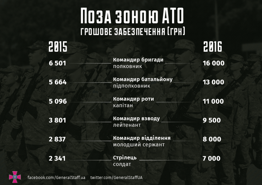 В Генштабе напомнили, что после повышения оклады военнослужащих по контракту вырастут более чем вдвое, и будут составлять: стрелок - 7 тыс. гривен (сейчас 2341 гривна), командир отделения - 8 тыс. гривен (сейчас 2837 гривен), командир взвода - 9,5 тыс. гривен (3801 гривна), командир роты - 11 тыс. гривен (5096 гривен), командир батальона - 13 тыс. гривен (5664 гривны), командир бригады - 16 тыс. гривен (в настоящее время 6501 гривна).