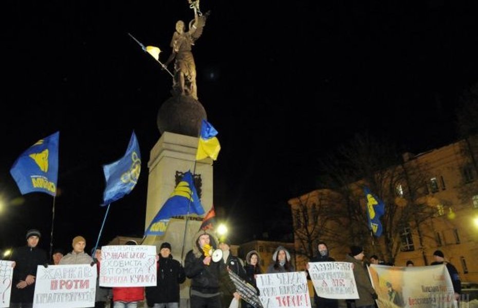 Активисты зажгли факелы на площади Свободы и продолжили их нести по центральным улицам Харькова. Некоторые из участников акции скрывали свои лица.