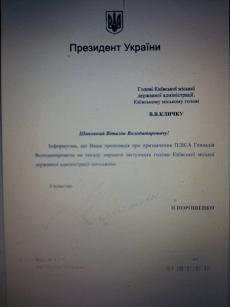 "Информируем, что Ваше предложение о назначении Плиса Геннадия Владимировича на должность первого заместителя председателя Киевской городской государственной администрации согласована", - говорится в сообщении, адресованном Президентом Украины Петром Порошенко председателю КГГА Виталию Кличко.