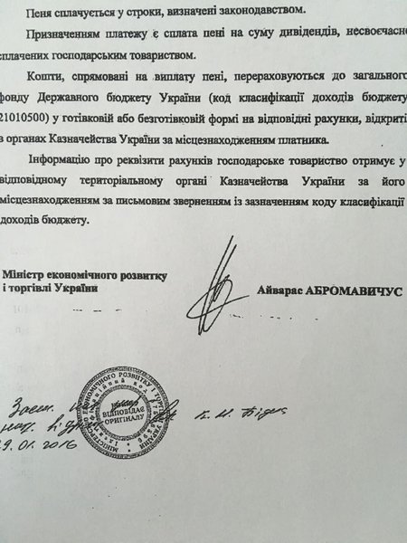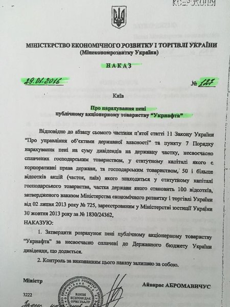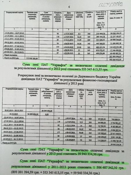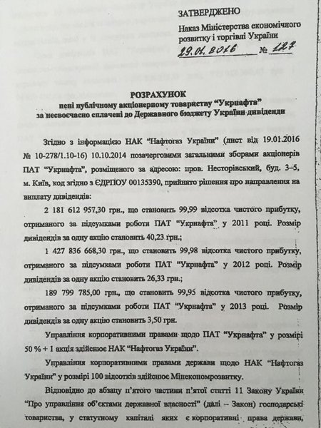 "Утвердить прилагающийся расчет пени публичному акционерному обществу "Укрнафта" за несвоевременно уплаченные в государственный бюджет Украины дивиденды", - говорится в документе.