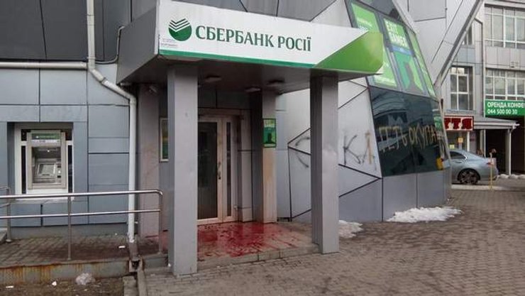 В частности, в Киеве активисты посетили некоторые отделения Сбербанка России и Проминвестбанк в районе станции метро "Святошино", где зарисовали и забрызгали окна и витрины красной краской, а также автозаправку "Амис" на Шулявке.