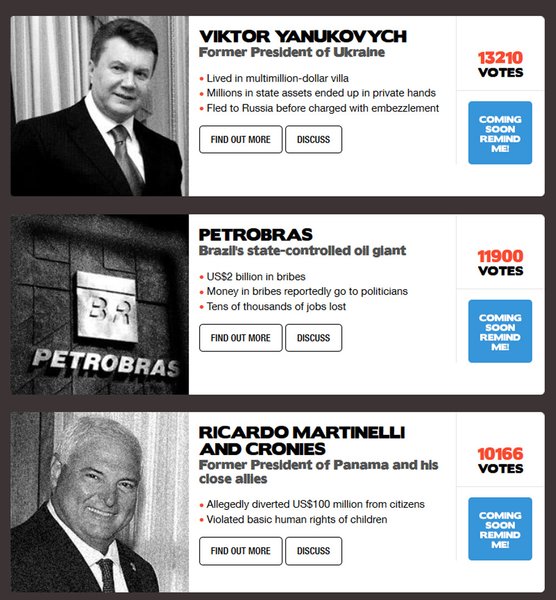 Коррумпированность чиновников в рейтинге определяли пользователи путем голосования в режиме "онлайн". Всего в рейтинге были представлены 15 личностей и компаний, которые так или иначе испортили свою репутацию громкими коррупционными скандалами, в "короткий список" голосования попали девять из них.