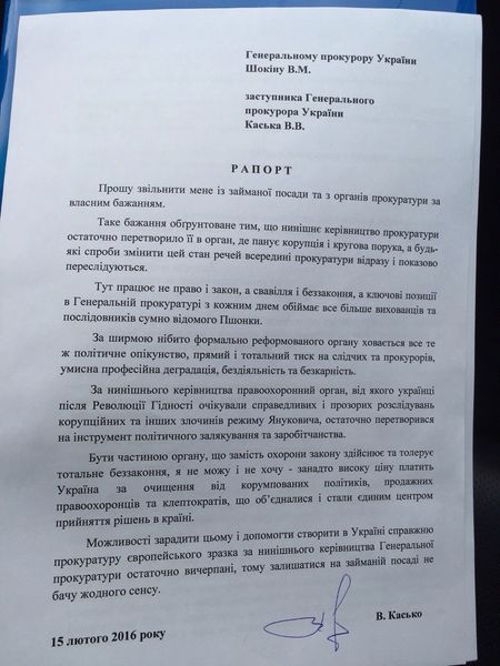 "Возможности помочь создать в Украине настоящую прокуратуру европейского образца нынешним руководством генеральной прокуратуры окончательно исчерпаны. Поэтому оставаться на занимаемой должности я не вижу никакого смысла", – говорится в рапорте.