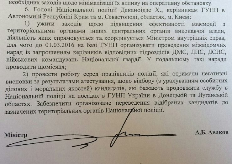 Согласно документу, главе Национальной полиции Хатии Деканоидзе и руководителям управлений НП на местах поручено "провести работу" среди желающих продолжить службу в управлениях Национальной полиции Донецкой и Луганской областей.
