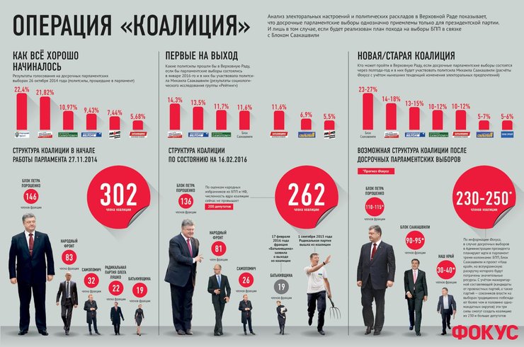 Распад парламентской коалиции продолжается. После неудачного голосования за недоверие правительству ее покинули Батькивщина и Самопомичь. Блок Петра Порошенко требует от премьер-министра Арсения Яценюка в течение трех недель предложить новый состав правительства и конкретную программу действий, иначе угрожает отправить его в отставку. Тем временем сам премьер, по информации Фокуса, продолжает консультации с президентом Украины Петром Порошенко и лидером Радикальной партии Олегом Ляшко, предлагая "политическим партнерам дать четкий перечень фамилий тех людей, которые придут в Кабинет министров". Будущее коалиции, парламента и правительства по-прежнему неизвестно.