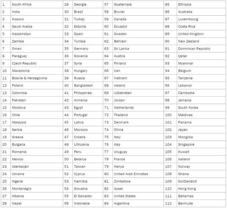 Замыкают список Бермуды, Багамы, Гонконг, Швейцария, Гана, Норвегия, Исландия, Кувейт, Япония и Монголия.