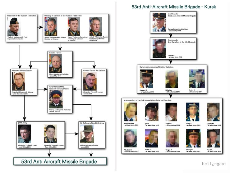 В разделе доклада "Командиры 53-й зенитно-ракетной бригады" изложена подробная информация о структуре командования бригады и дивизиона, которые предоставили вероятное орудие убийства пассажиров MH17 (а подчиненные этому командованию военнослужащие, возможно, привели его в действие).