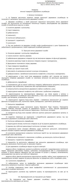 Документом устанавливается, что государственные служащие в своей деятельности "руководствуются принципами этики государственной службы, основанные на положениях Конституции Украины, законодательства о государственной службе и предотвращении коррупции, а именно: служение государству и обществу; достойное поведение; добродетель; лояльность; политическая нейтральность; прозрачность и подотчетность; добросовестность".