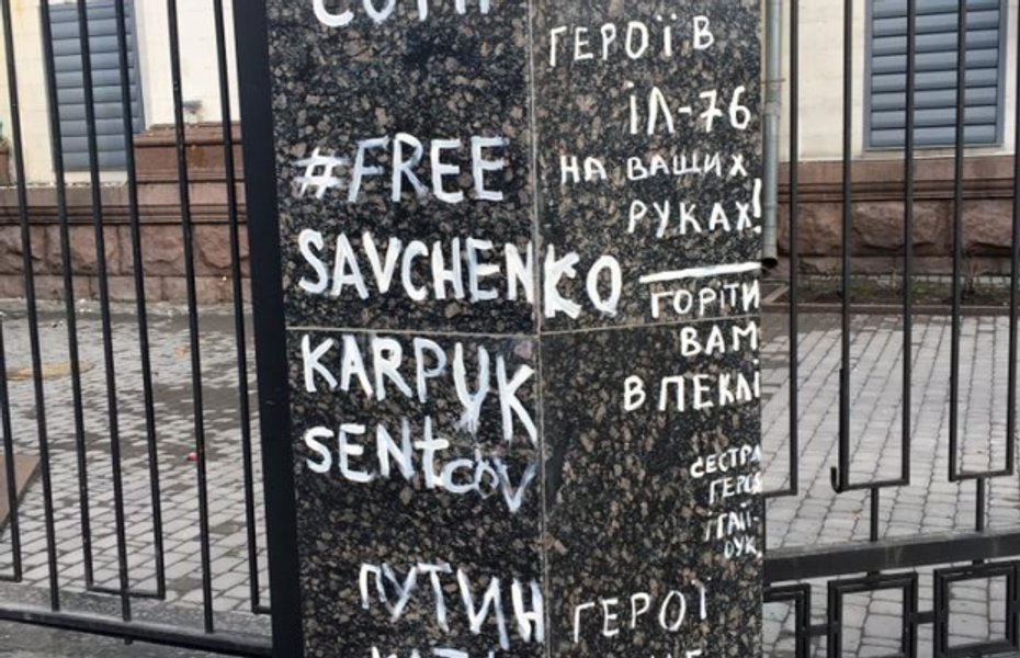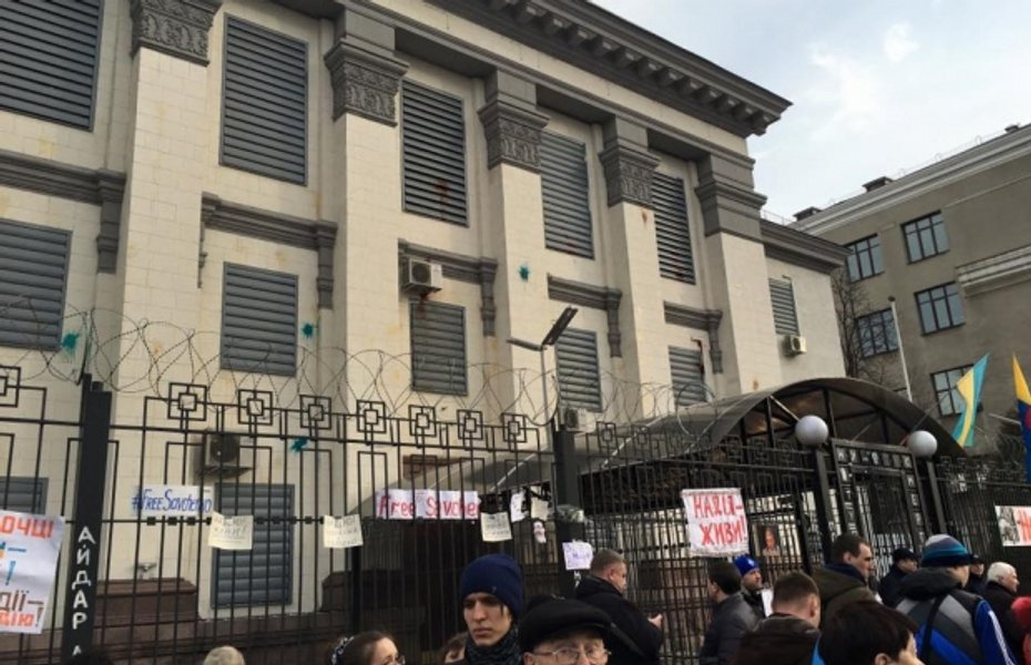 Участники проходящей в Киеве акции в поддержку народного депутата, делегата Украины в ПАСЕ, украинской летчицы Надежды Савченко, незаконно заключенной в России, забросали здание посольства России в Украине яйцами, а впоследствии - и зеленкой.
