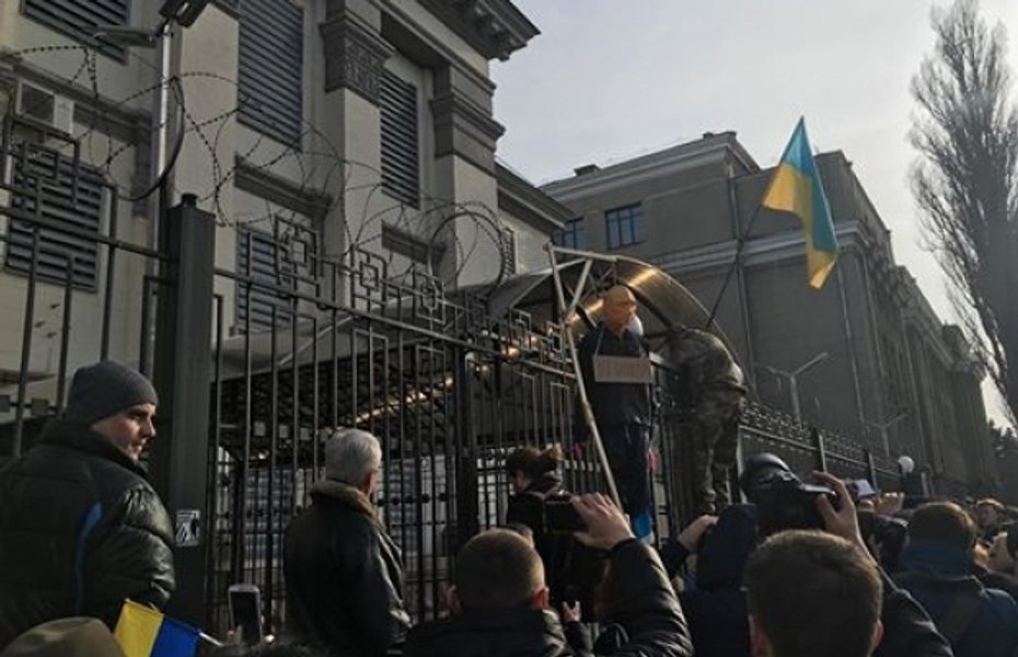 Пришедший на акцию народный депутат от Радикальной партии Игорь Мосийчук сообщил в своем Facebook, что протестующие вывесили над входом в посольство флаг Украины. Кроме того, судя по выложенным депутатом фотографиям, активисты разместили возле посольства "виселицу" с куклой, изображающей президента России Владимира Путина, с табличкой "убийца".