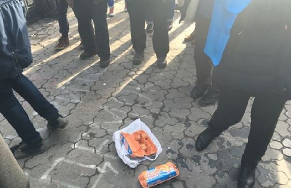 Полицейские, стоявшие рядом, не реагировали на то, что участники акции бросают яйца в здание посольства.