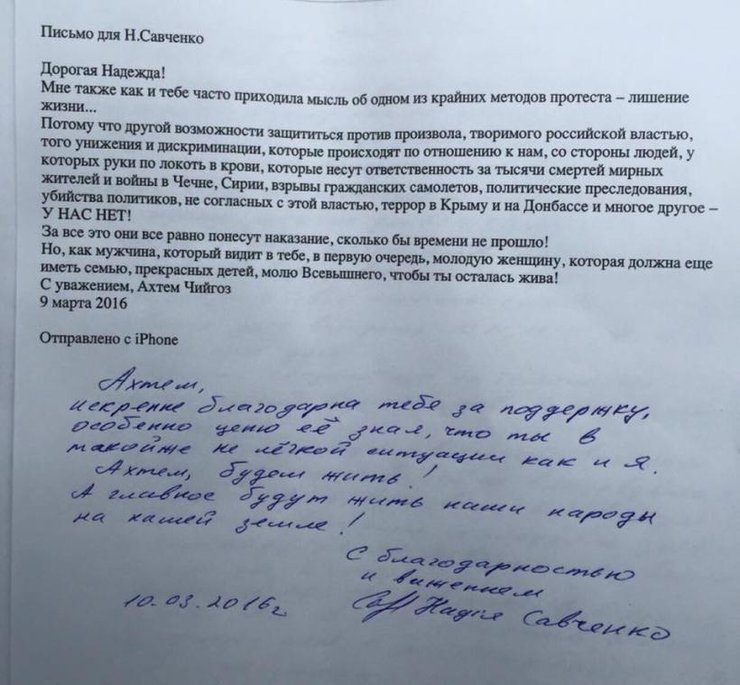 Ахтем Чийгоз написал, что ему, как и Надежде Савченко, часто приходила мысль о крайней форме протеста – лишении себя жизни. Ведь у политзаключенных нет другой возможности: "Защититься от произвола, творимого российской властью, того унижения и дискриминации, которые происходят по отношению к нам со стороны людей, у которых руки по локоть в крови".
