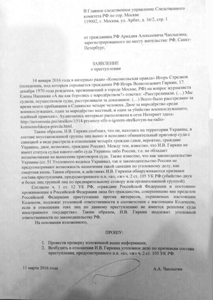 Глава специализированной коллегии адвокатов "Призывник" написал заявление в Главное следственное управление РФ с просьбой возбудить уголовное дело в отношении Стрелкова. Поводом для этого стали признания бывшего лидера боевиков, которые он сделал в интервью радио "Комсомольская правда" в январе.