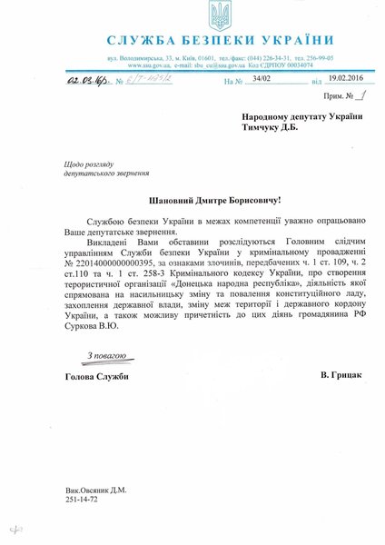 "Как следует из ответа главы СБУ на мое депутатское обращение, Сурков таки фигурирует в уголовном деле о создании и деятельности террористической организации "ДНР", - написал депутат и опубликовал скан-копию документа.