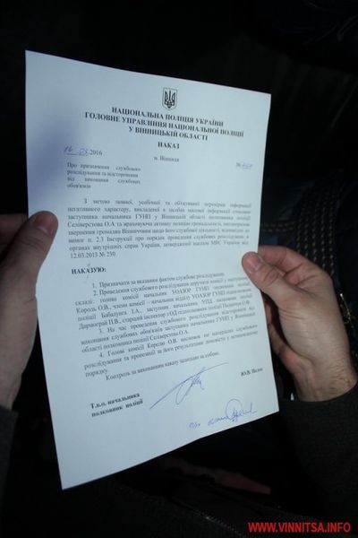 "С целью всесторонней и объективной проверки информации негативного характера, изложенной в средствах массовой информации в отношении заместителя начальника ГУ Национальной полиции в Винницкой области Селиверстова А.А. и учитывая активную позицию общественности, требования п. 2.3 Инструкции о проведении служебных расследований, на время служебного расследования отстранить Селиверстова от исполнения служебных обязанностей", - говорится в приказе.