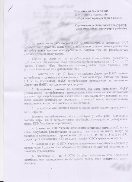 Также в документе утверждается, что директор и работники НАБУ якобы не имеют оснований для доступа к материалам уголовного производства. При этом Шабунин отмечает, что ч.5 ст. 216 УПК позволяет детективам расследовать в случае необходимости любое уголовное производство.