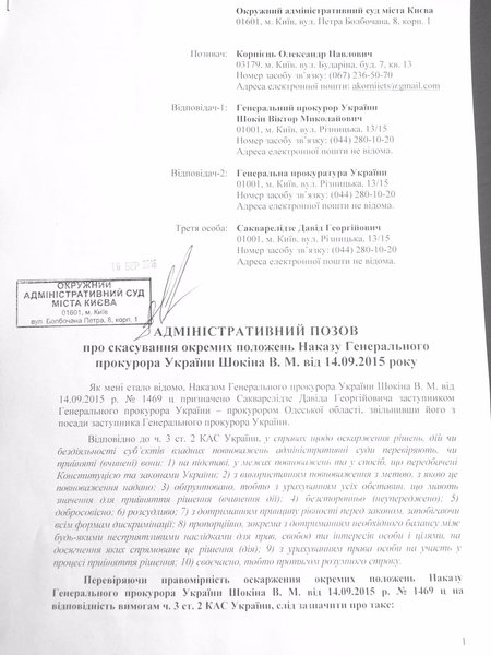 "Мне стало известно о том, что 14 апреля 2016 года Окружной административный суд Киева рассмотрит иск об отмене приказа ГПУ о назначении на должность заместителя генпрокурора Давида Сакварелидзе. Мной подан аналогичный иск 16 марта 2015 года, однако дата заседания не определена", - написал Корниец.