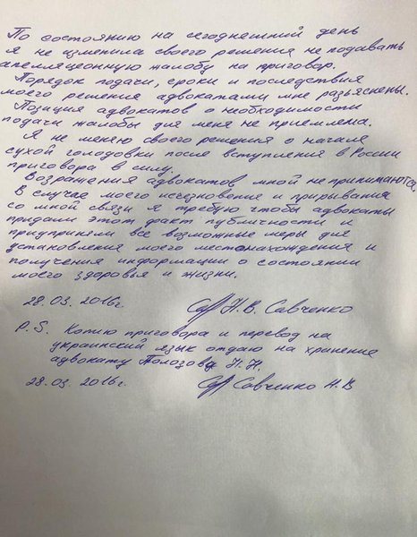 Незаконно осужденная в России украинская летчица, народный депутат и делегат Украины в ПАСЕ Надежда Савченко не изменила решения не подавать апелляцию на приговор и начать сухую голодовку после вступления его в силу. Также Савченко допускает, что может "исчезнуть". Об этом говорится в ее письме, которое опубликовал в своем Facebook адвокат Николай Полозов.