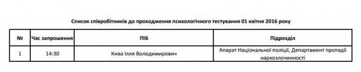 Начальник департамента противодействия наркопреступности Национальной полиции Украины Илья Кива 1 апреля должен пройти психологическое тестирование MIDOT для сотрудников Нацполиции, сообщает "ВВС Украина".