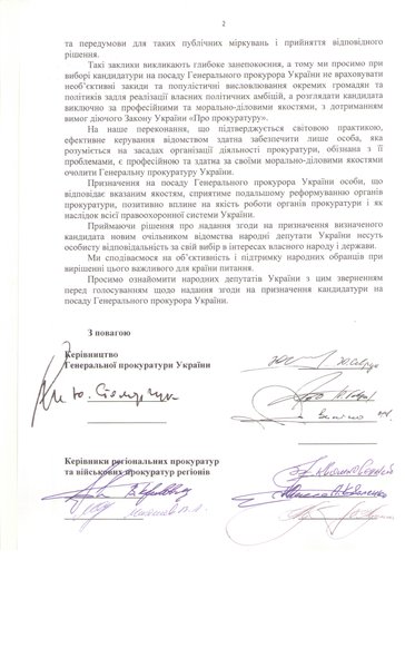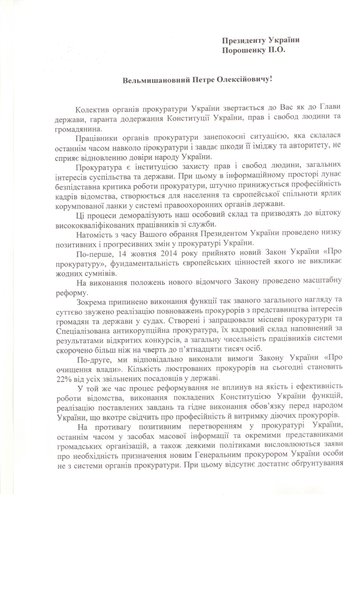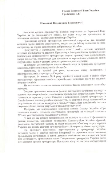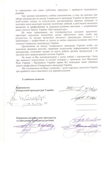 Открытое письмо подписали первый заместитель генпрокурора Юрий Севрук, заместители генпрокурора Юрий Столярчук, Олег Залиско, Роман Говда, а также 29 руководителей областных и военных прокуратур. Они в своем письме просят Порошенко и председателя парламента Владимира Гройсмана ответственно подойти к вопросу назначения генпрокурора.
