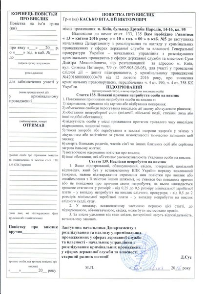 "Вам необходимо явиться 13 апреля в 10:00 в кабинет №5 к заместителю начальника департамента по расследованию и надзору в уголовных процессах в сферах государственной службы и Генеральной прокуратуры Украины - начальнику управления по расследованию уголовных производств в сферах государственной службы и собственности Сусу Дмитрию Николаевичу", - говорится в повестке.
