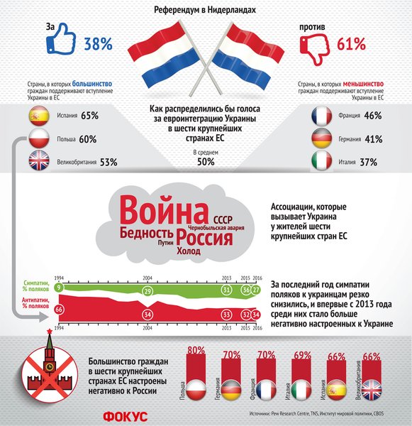 На референдуме об Ассоциации Украины и ЕС, прошедшем в начале апреля в Нидерландах, большинство голландцев высказалось против ратификации соответствующего соглашения. С одной стороны, это решение вызвано их скептическим отношением к Евросоюзу в целом. "Голосовали против ЕС, а не против Украины", — считает Кейс Верхувен, депутат нидерландской партии D-66, поддерживающей украинскую евроинтеграцию. С другой стороны, отношение европейцев непосредственно к Украине с каждым годом становится все менее позитивным. Согласно прошлогодним исследованиям, вступление Украины в ЕС поддержало бы меньшинство французов, немцев и итальянцев. А опросы 2016 года демонстрируют снижение симпатий даже среди главных лоббистов Украины в ЕС — поляков. В числе причин, влияющих на международный имидж страны, — политическая нестабильность, экономический кризис и вооруженный конфликт в Донбассе, а также массированная антиукраинская кампания, развернутая Россией в странах Евросоюза, которой Киев не смог ничего противопоставить. Впрочем, пропаганда собственный имидж РФ не улучшила: большинство европейцев относится к россиянам негативно.