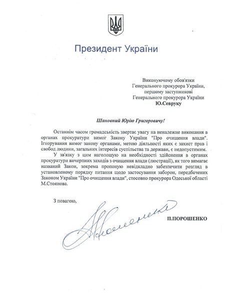 Президент Украины Петр Порошенко написал исполняющему обязанности генерального прокурора Юрию Севруку письмо с требованием уволить прокурора Одесской области Николая Стоянова в порядке люстрации. Об этом сообщил спикер главы государства Святослав Цеголко в Facebook.