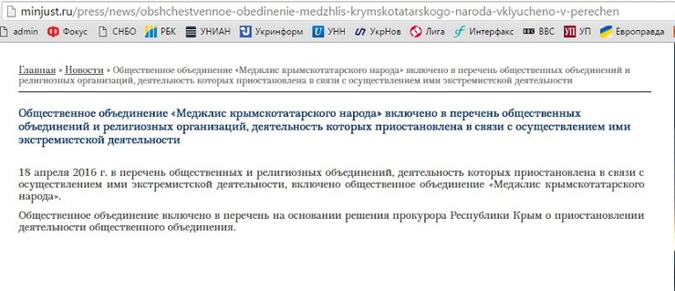 "18 апреля 2016 года в перечень общественных и религиозных объединений, деятельность которых приостановлена в связи с осуществлением ими экстремистской деятельности, включено общественное объединение "Меджлис крымскотатарского народа". Общественное объединение включено в перечень на основании решения прокурора Республики Крым о приостановлении деятельности общественного объединения", – указывается в сообщении.