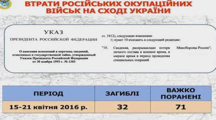 За неделю 15-21 апреля в Донбассе погибли 32 российских военных, еще 71 получил ранения. Об этом сообщил представитель главного управления разведки министерства обороны Украины Вадим Скибицкий, передает ЛІГА.net.