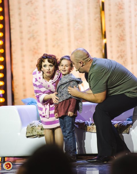 Кстати, в номере "Костюм на День мамы" сыграл 6-летний сын Евгения Сморигина- Леша. Звездные партнеры, Егор Крутоголов и Виктория Булитко, полный зал зрителей, софиты и камеры не смутили маленького актера. Леша отлично справился с ролью. Звездный папа рассказал, что брал сына последние несколько дней на репетиции.