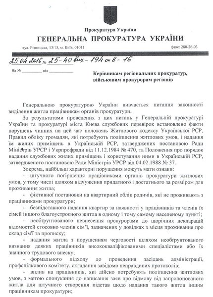 Исполняющий обязанности генерального прокурора Юрий Севрук дал поручение руководителям региональных прокуратур и военным прокурорам регионов проверить законность выделения жилья работникам прокуратуры. Об этом сообщает пресс-служба ГПУ.