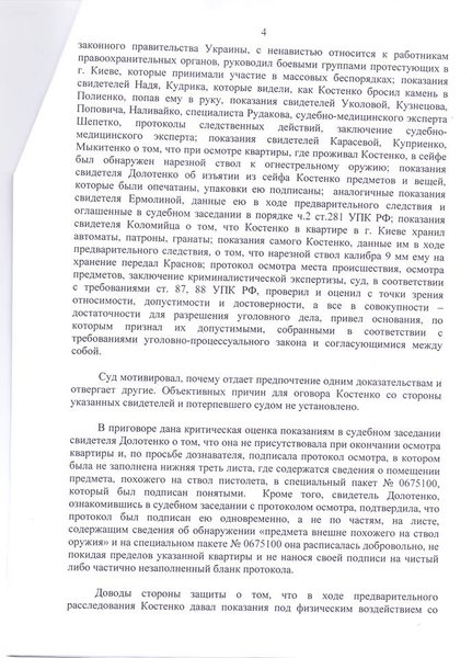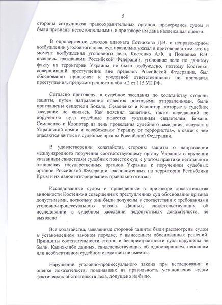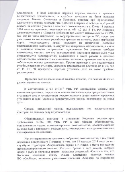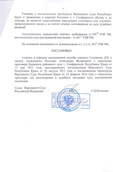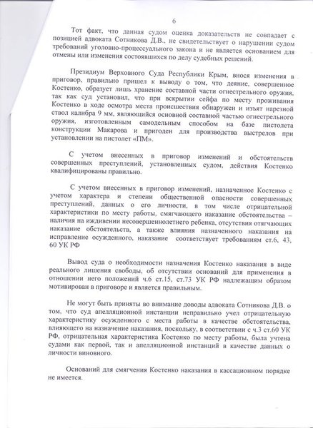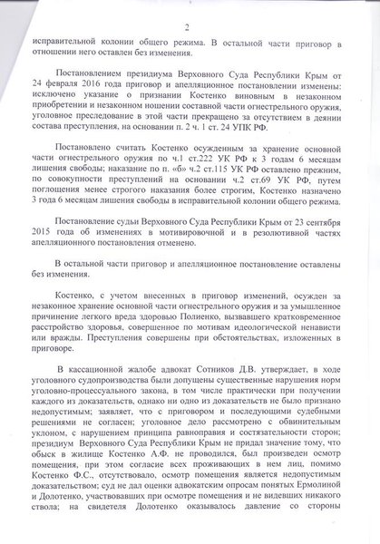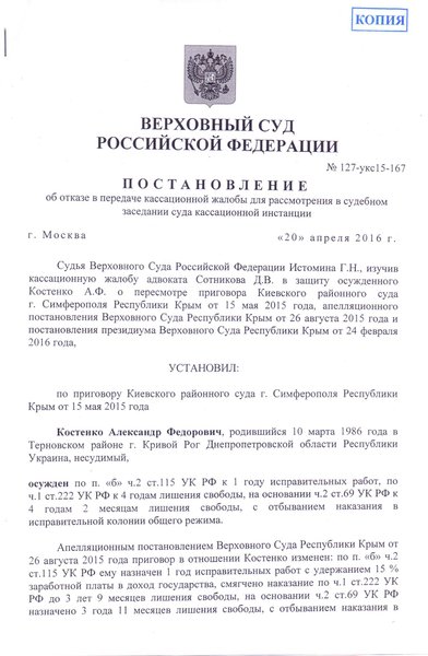 Кассационная жалоба на приговор Костенко была направлена в Верховный суд России в конце марта 2016 года. Суть жалобы - отмена приговора Костенко, которому в Крыму присудили четыре года и два месяца тюремного заключения.