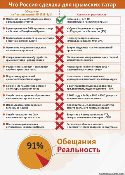 "Из двенадцати обещаний, данных крымским татарам российской властью в 2014 году, спустя два года выполнено только одно, да и то – наиболее декларативное. Таким образом, нереализованные обещания руководства нынешней "Республики Крым" превысили 91%", - говорится в публикации.