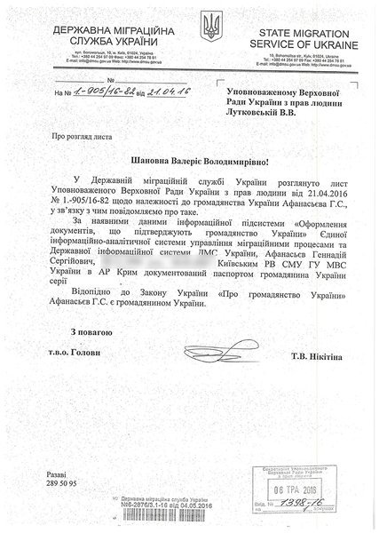 "По имеющимся данным информационной подсистемы "Оформление документов, подтверждающих гражданство Украины" Единой информационно-аналитической системы управления миграционными процессами и Государственной информационной системы ГМС Украины, Афанасьев Геннадий Сергеевич Киевским РО СГУ ГУ МВД Украины в АР Крым, документирован паспортом гражданина Украины", – говорится в сообщении.