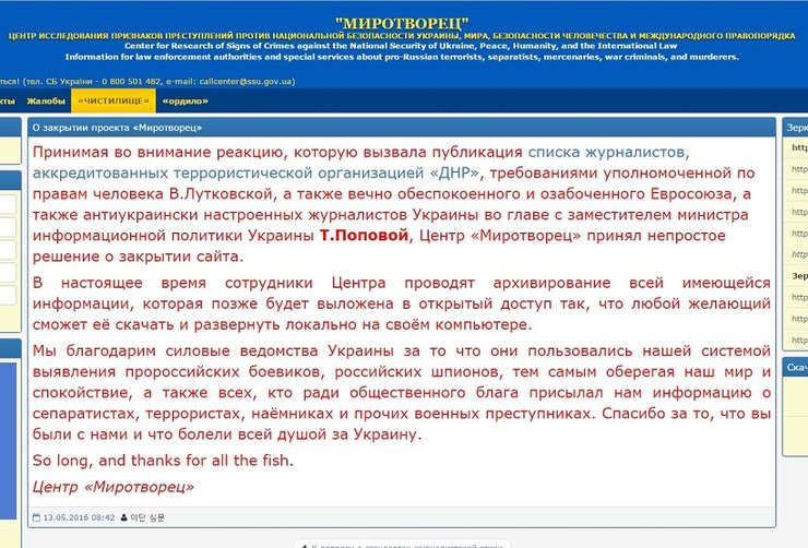"Принимая во внимание реакцию, которую вызвала публикация списка журналистов, аккредитованных террористической организацией "ДНР", требованиями уполномоченной по правам человека В.Лутковской, а также вечно обеспокоенного и озабоченного Евросоюза, а также антиукраински настроенных журналистов Украины во главе с заместителем министра информационной политики Украины Т.Поповой, Центр "Миротворец" принял непростое решение о закрытии сайта", – говорится в сообщении.
