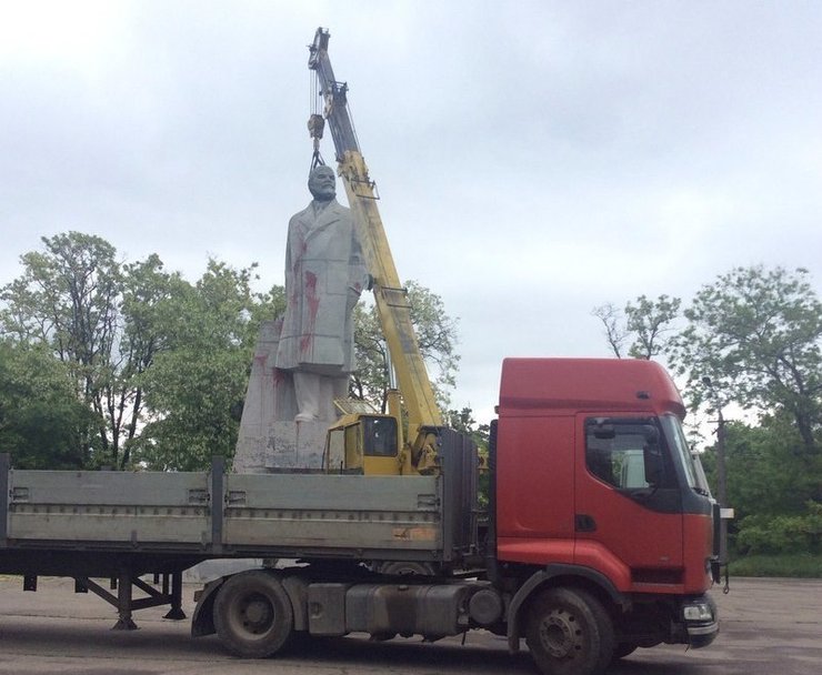 Сегодня с утра памятник Ленину в Одессе начали разбирать на семь составных блоков, над этим работали два крана и грузовик.