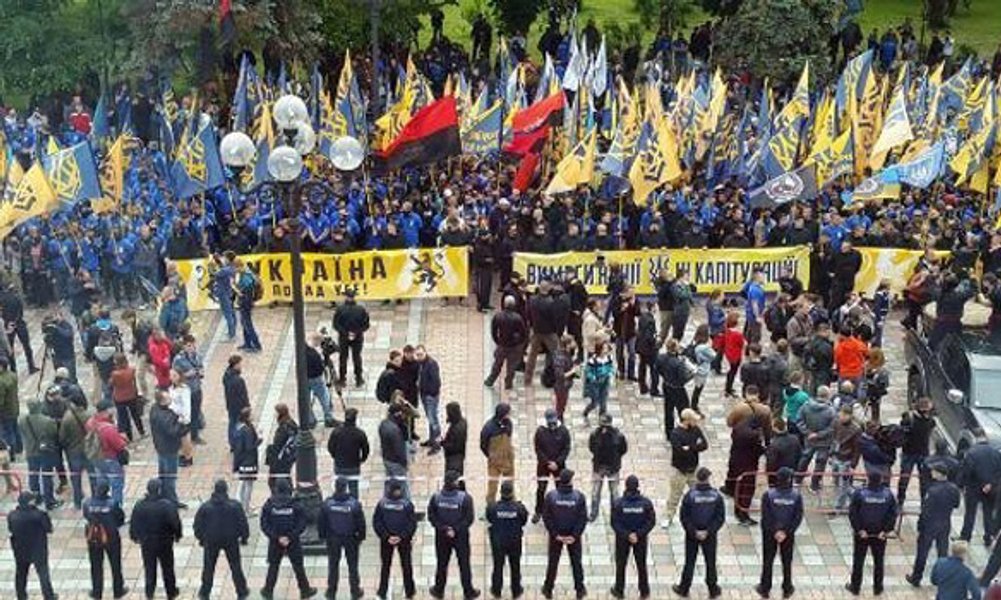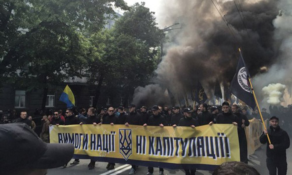 Марш "Азова" проходил под лозунгом "Требования нации - нет капитуляции". В частности, представители "Азова" выступают против проведения выборов в Донбассе "по российскому сценарию".