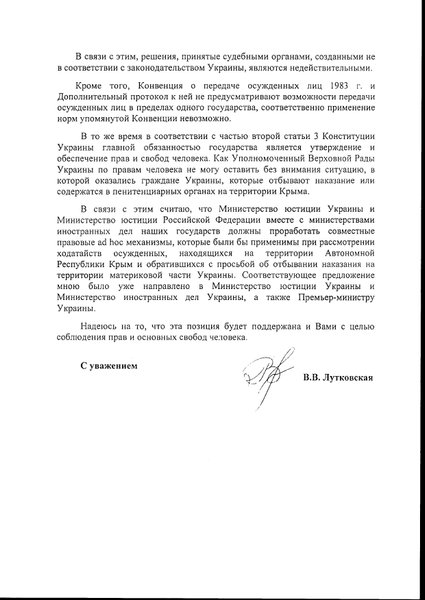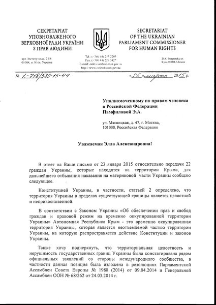 Ранее российская омбудсмен Татьяна Москалькова сообщила, что Украина отказывается принимать этих граждан. В ответ Валерия Лутковская предположила, что Москалькова, не так давно занявшая свою должность, не успела разобраться в вопросе. "Все наши предложения были отклонены предшественницей госпожи Москальковой, Эллой Памфиловой, или предлагалось применение неприемлемых норм международного права, использование которых означало бы признание Украиной юрисдикции России в Крыму", - сказала она.
